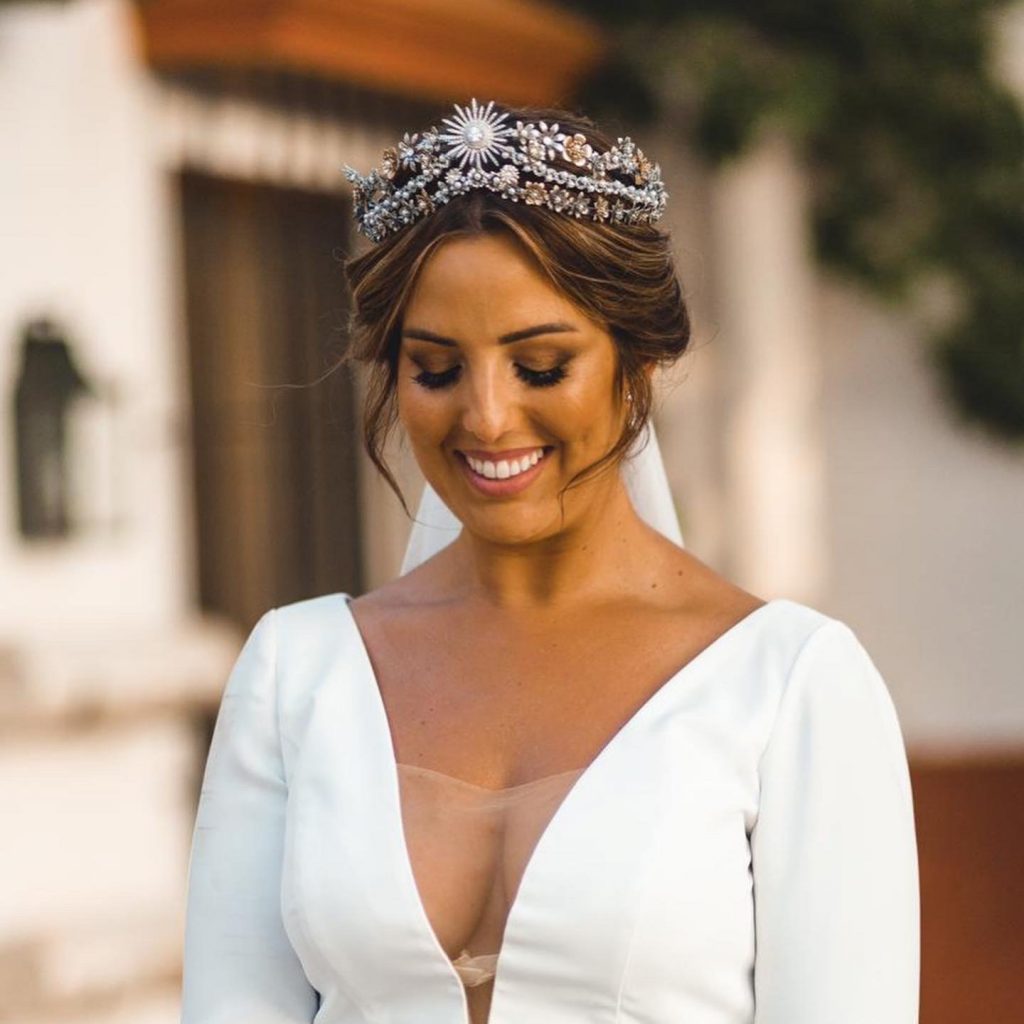 El vestido es el punto de partida. Si tu vestido de novia es sencillo y de líneas limpias, una tiara con más presencia puede elevar el conjunto y aportar carácter. En cambio, si el vestido es muy trabajado, con encajes, pedrería o detalles protagonistas, lo ideal es optar por una tiara más delicada que acompañe sin restar protagonismo.