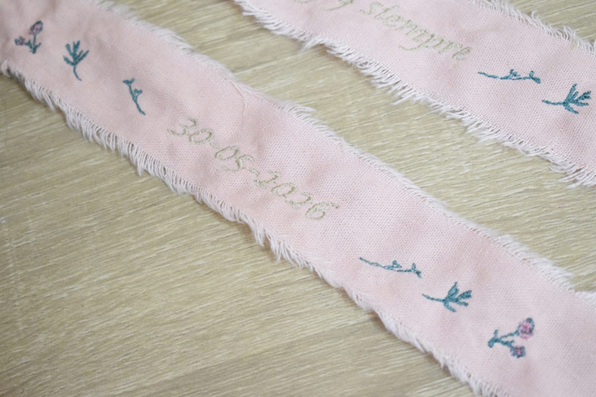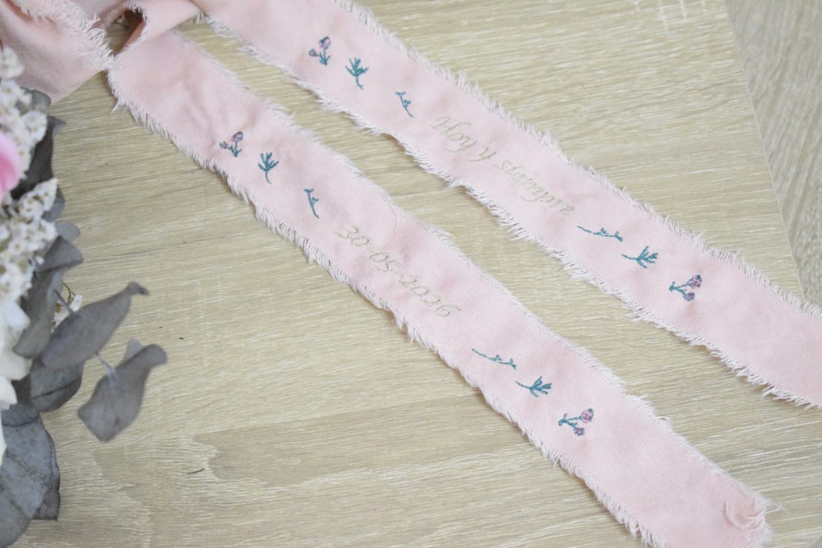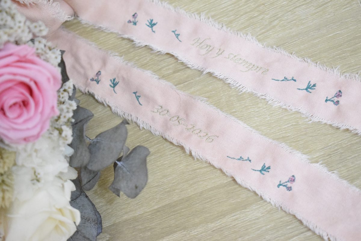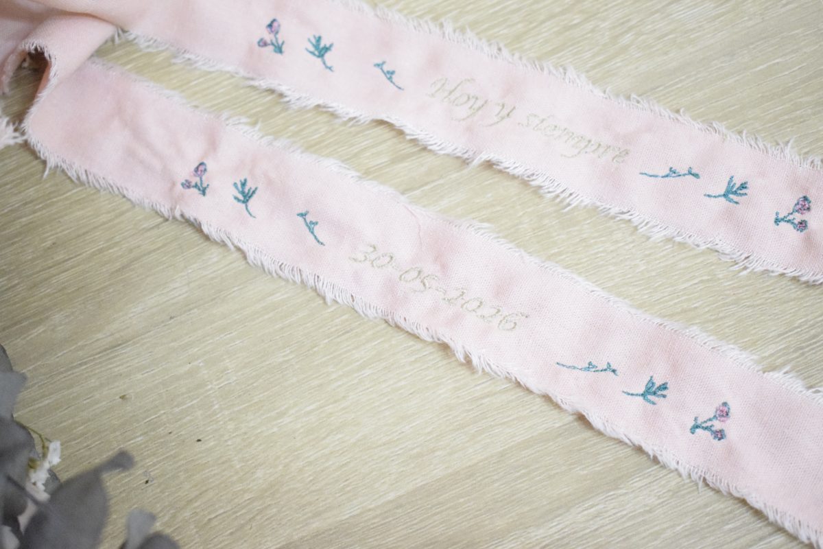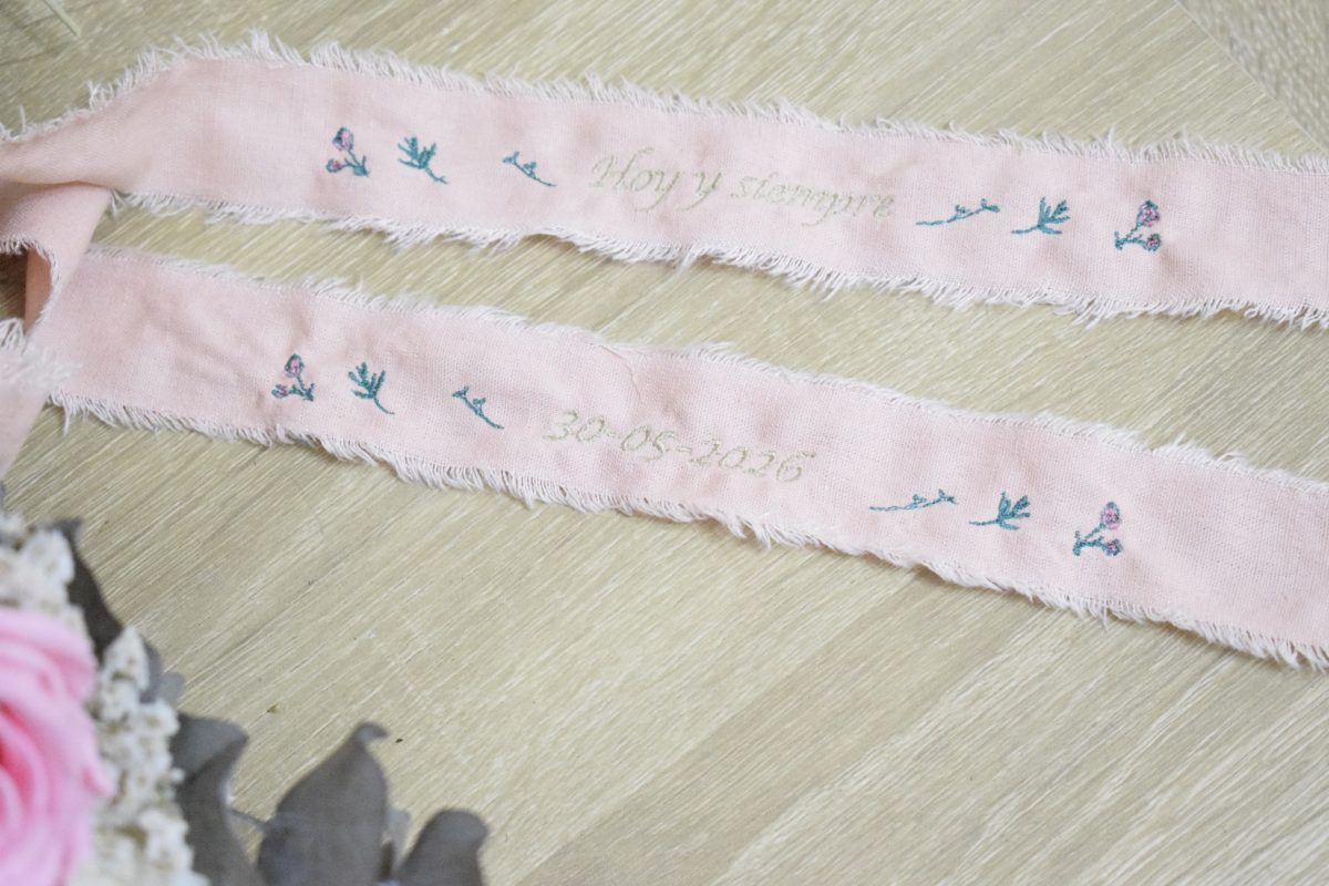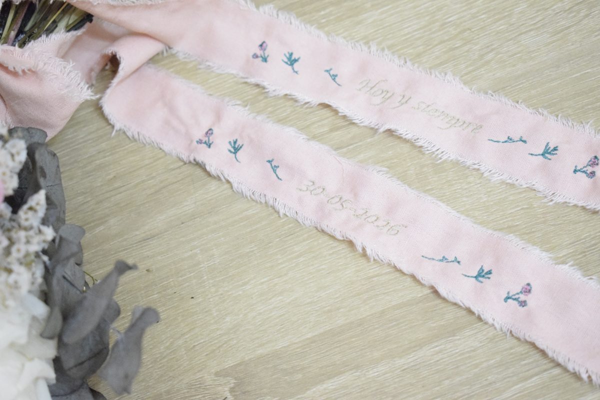 Nuestro lazo de algodón bordado para ramo de novia es ese pequeño detalle que transforma tu ramo en algo verdaderamente único y lleno de significado.